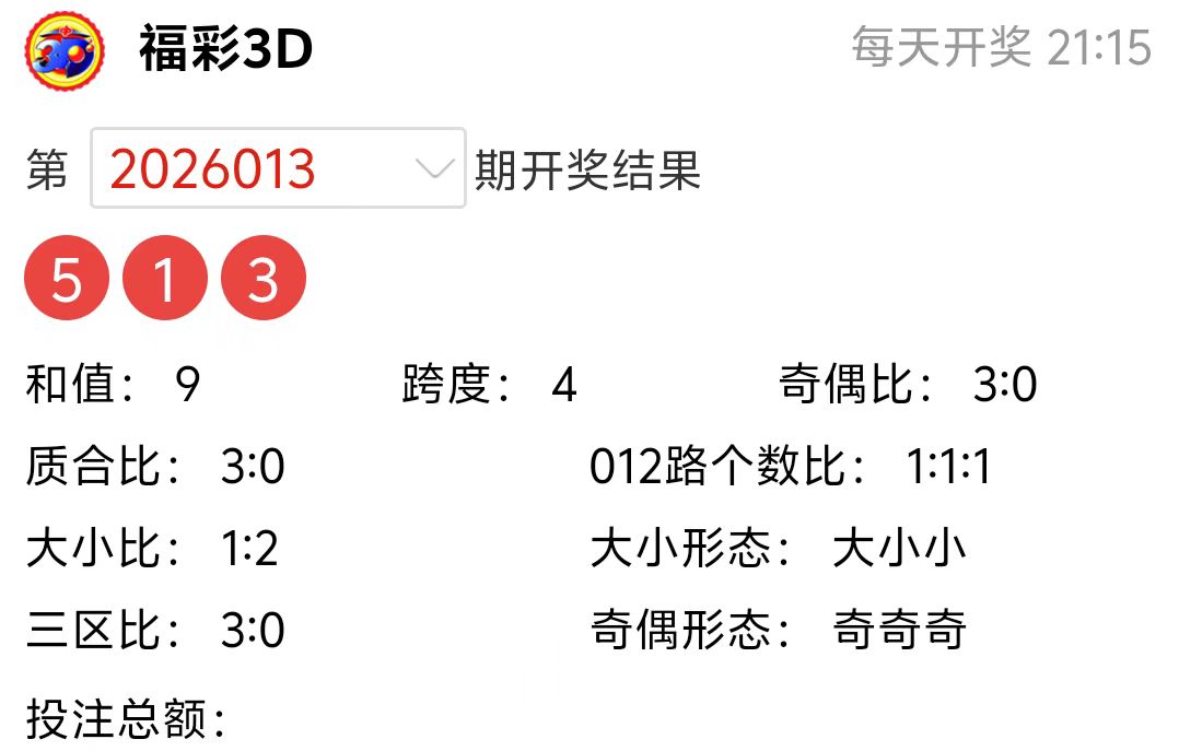 福彩3D上期(2026013期)开奖号码详情