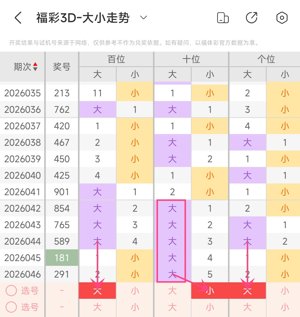 首先让我们回顾一下上期福彩3D第2026046期开奖号码为291,为组六形态,大小比为1:2,奇偶比为2:1,跨度为8,和值为12。