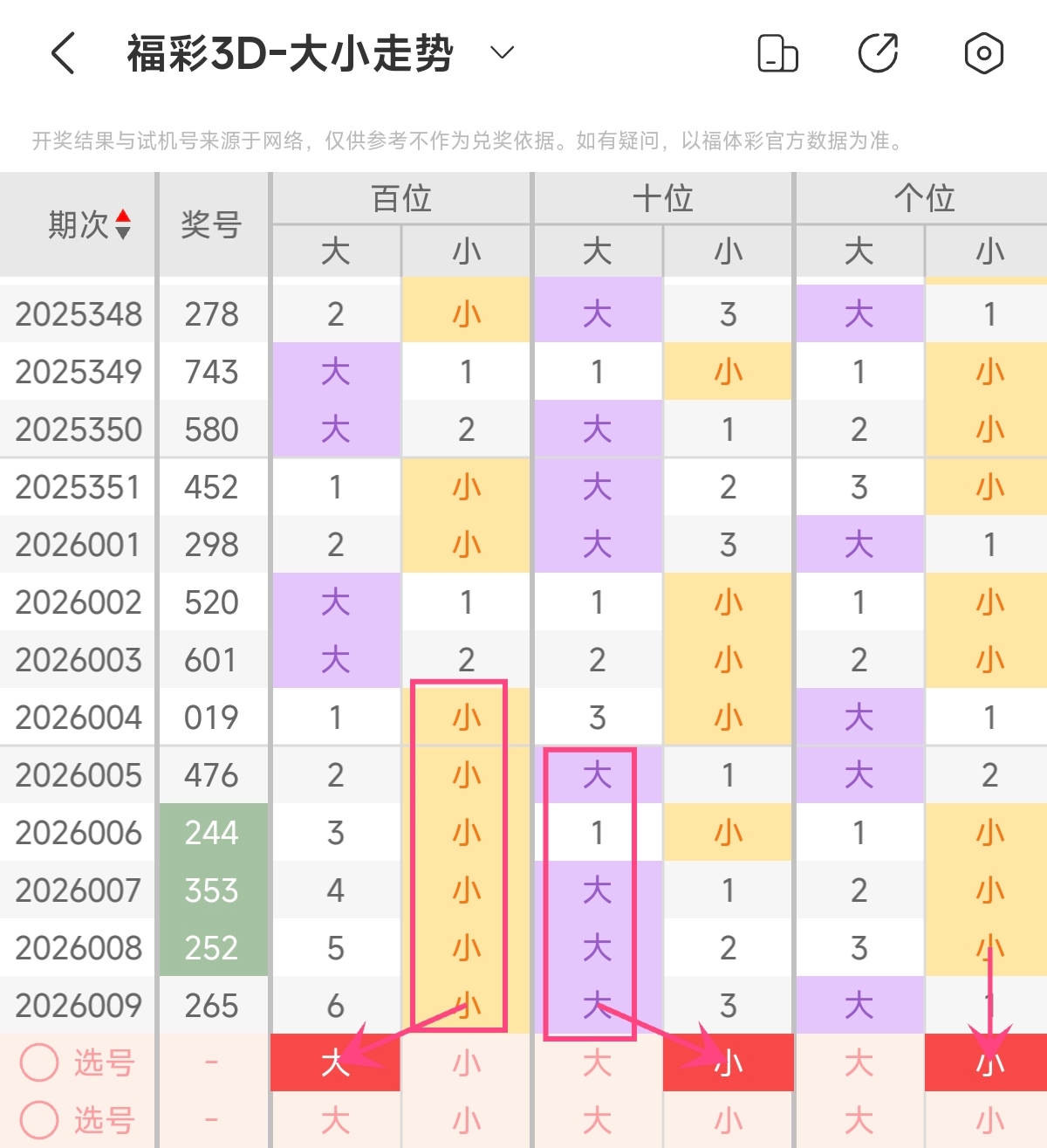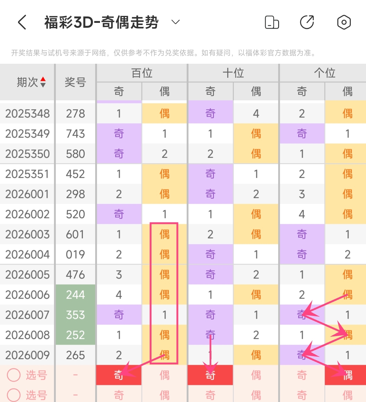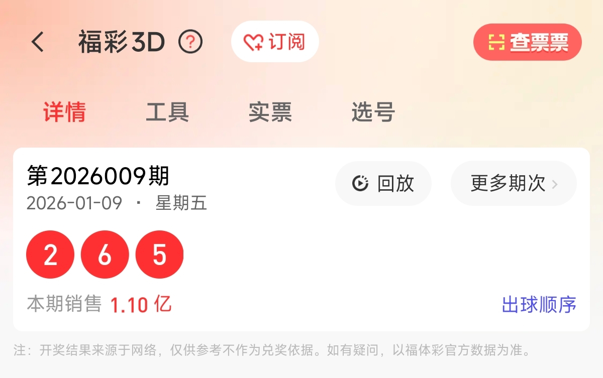 首先让我们回顾一下上期福彩3D第2026009期开奖号码为265 ,为组六形态,大小比为2:1,奇偶比为1:2,跨度为4,和值为13。