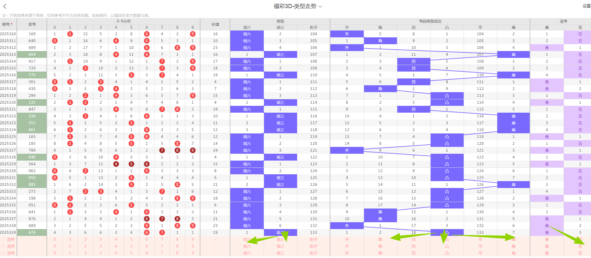 今天福彩3D第2025340期的趋势判断为:方向主看组六防组三;跨度回升明显;和值回落概率较大;