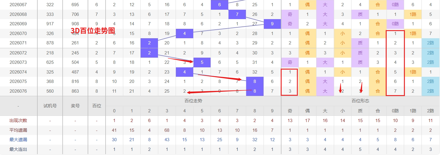 福彩3D百位分析:第2026076期百位开出号码8属于大偶数,从上面百位走势图上可以看出近100期大小比约为48:52奇偶比约为55:45。近期数据还是比较极端的符合文章开头介绍的求均衡规律非等量现象。但这种均衡不会持续最终会被偏态运行打破,然后循环往复。但短期内大小相差0点,小数过热大数有回补需求本期个人认为走大数的概率更高。上期百位落号“8”号球,在百位号码开出2路号码8后向大数方向走出0个振幅。那么通过分析上期百位落位号码分析,号码走出0个振幅,号码走为大偶数,开出2路号码8。通过对百位落号趋势来分析,百位号码落位后端,通过对近10期的走势来看百位号码大小交替频繁走3期大数又走2小数,3D百位走势近期呈现“冷热两极”的鲜明特征,其中0已进入深度冷态区域,遗漏值持续拉升,远超其理论出号周期,从数字轮动的内在规律来看,百位作为高位指标,长期缺失后往往积蓄着较强的回补动能——尤其是当前整体号码分布偏向中高区,冷号0的洼地效应已极为突出,一旦周边热号出现短暂歇脚,冷号0极有可能以突袭方式打破僵局,进入回补周期。而另一侧,6则处于明显的热出通道,近期在百位频繁现身,出号间隔紧凑且无长期遗漏,我们在百位关注的重点在01267这5个号码球上,百位号码近期奇偶切换频繁,8号球码属于2路号码偶数,现偶数开出过多有向偶数的趋势。所以福彩3D第2026077期百位看01267