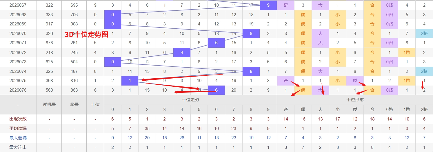 福彩3D十位分析:第2026076期十位开出号码6属大偶数号码中端。以历史100期数据为例十位奇偶比约为55比45,大小比约为51比49近期大小相差5点,根据求均衡的规律开出大数的概率比小数高一点。上期我们分析奇数经过连续回补后有走偶数的可能,开出奖号6大偶数符合我们的预期,3D十位走势近期呈现出冷号待补、温号升温的典型过渡格局,其中2已进入较长的冷态周期,遗漏值明显超出历史平均间隔,从十位数字的波动规律来看,长期缺席的冷号往往在盘面趋于平衡时迎来集中回补,尤其是当前十位整体出号偏向中高区,冷号2作为低位数字,其价值洼地属性已非常突出,随时可能以单点直落的形式结束遗漏。而9则正处在一个关键的升温节点上——此前它长期以温号形态平稳运行,出号频率不高不低,但近期出现间隔缩短、露面频次增加的明显迹象,所以福彩3D第2026077期十位推荐24579。