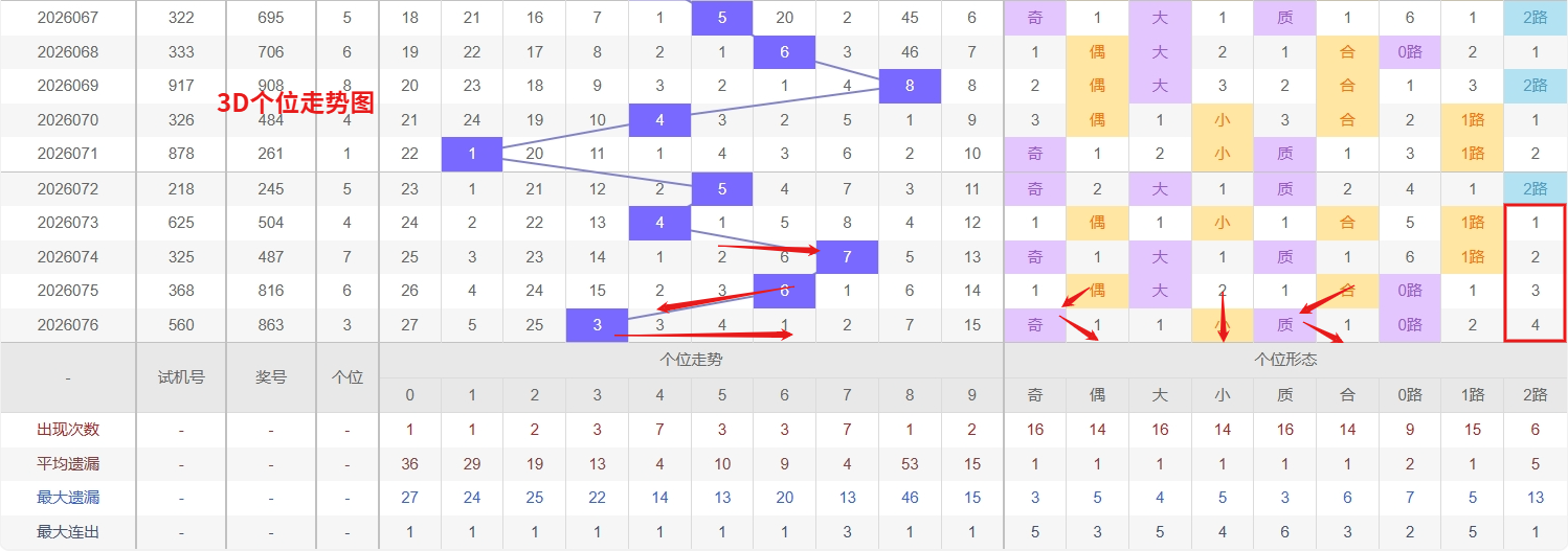 福彩3D个位分析:第2026076期个位开出号码3属于小奇数前端,从以上个位走势图中可以看出近100期的大小比约为48:52奇偶比约为53:47大小奇偶数据上有点差异有需求但不是太明显,不太好看这时就要借助连线走势和遗漏数据来帮助我们缩水号码。上期个位落号“3”小奇数0路号码球,号码开出了3振幅,连续多期的大振必被小振幅取代幅符合我们的预期,那么本期我们在个位考虑振幅走势走前依然要转变思路考虑大振幅,具体考虑(2-6)个振幅是我们主要的方向,那么在对个位落号情况进行系统的分析时我们可以明显的看到个位号码走势呈现大范围震荡,尤其是在号码的落位特点上表现的尤为突出,那么本期我们在个位分析时就要注意号码的风险,避免出现踏空。3D个位走势近期呈现出双冷待补、一温转热的典型蓄势格局,其中0和8双双进入深度冷态区域,两个冷号并列遗漏的情况在个位走势中并不多见,从数字回补的均衡性来看,个位作为末位号码,长期缺失的冷号往往具备较强的反弹预期,尤其是当两个冷号同时处于超期状态时,盘面本身就积蓄了较大的修正压力,一旦其中一个率先开出,另一个也极有可能在短期内跟进,形成冷号的连锁回补。而6则正处在一个由温转热的临界节点上——此前它以温号形态平稳运行,出号频率不温不火,但近期间隔明显缩短、露面意愿增强,从个位号码的渐变规律分析,因此福彩3D第2026077期个位看好01568。