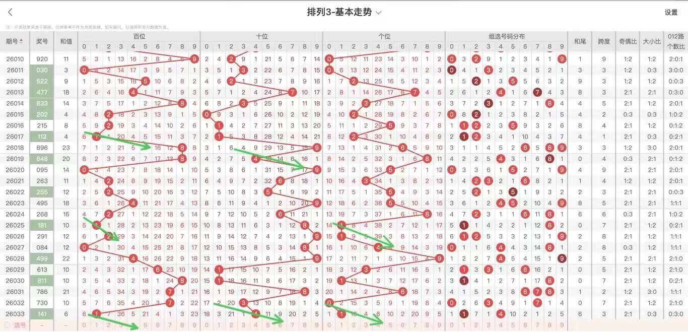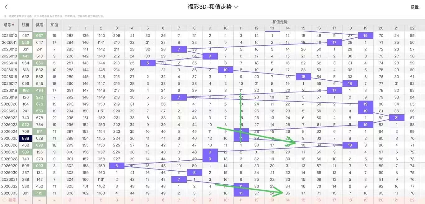 2026034期福彩3D和值走势图如下:上期开出和值11,和值在第2分区,而近百期开出和值11共9次,下期数据:16 13 21 19 9 11 18 11根据和值11的下期钟摆走势来看升趋势稳定,近期和值喜在第2分区活动,和值形态规律:奇:大和尾形态奇:大,那么本期重点推荐值范围是:9-19主奇形态