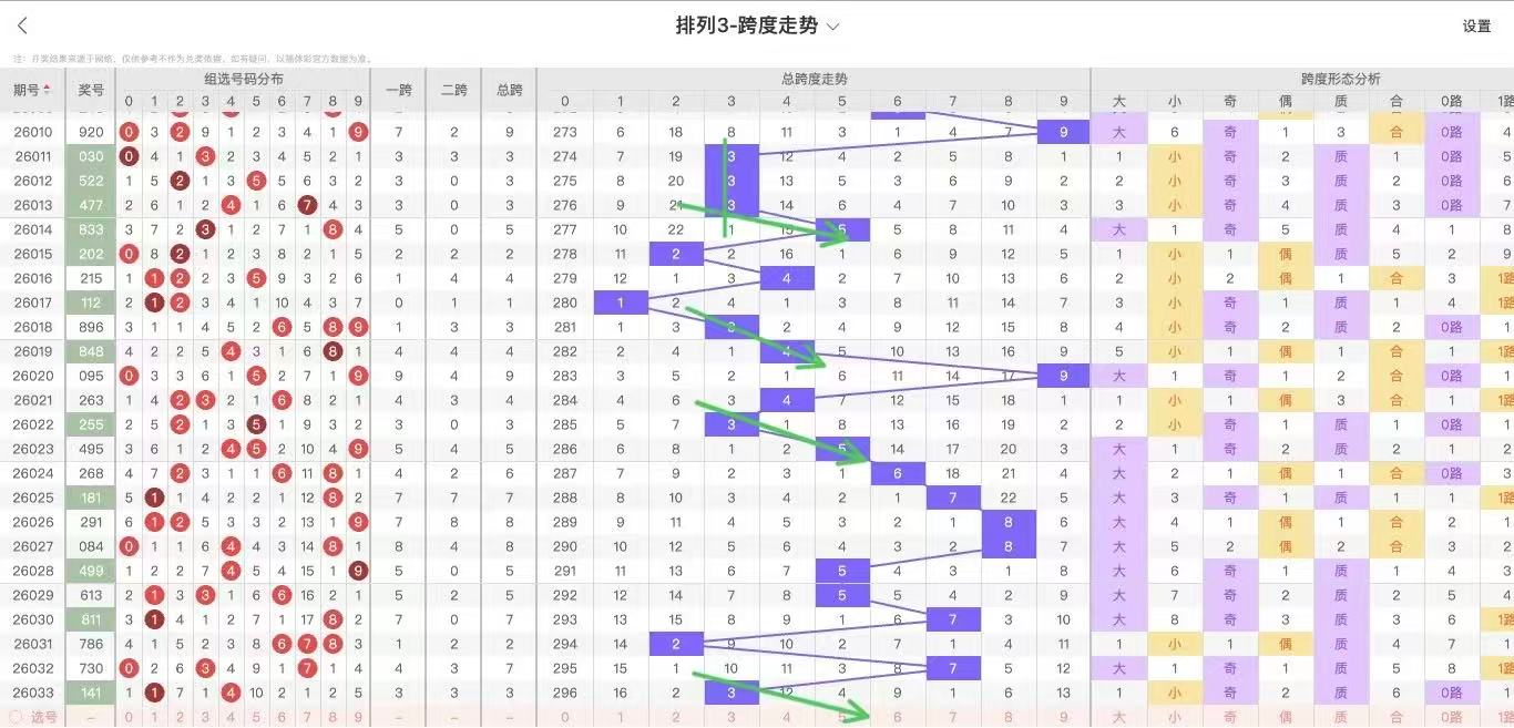 10期内跨度走势为:6-7-8-8-5-5-7-2-7-3,10期内大小跨比为8:2,奇偶跨比6:4,百期内跨度3共开出18次,下期数据:4 5 3 5 9 5 7 1 7 6 4 8 3 3 5 4 5 近期度较热,考虑跨度7开出后容易出大跨度,近期大小规律下大:偶:合,所以接下来继续大跨,偶跨度表现!
