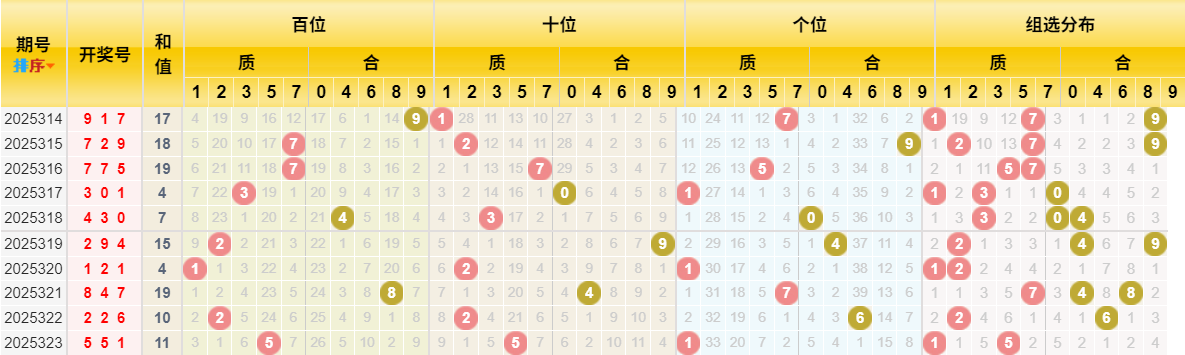 上期开出组三形态(对子)。值得注意的是,根据历史同期数据分析,在目前已开出的22次第323期奖号中,组三形态出现了8次,而组六形态出现了14次。这表明在历史同期,组六是更常见的形态。结合近期组三与组六交替出现的规律,本期重点看好回归组六形态