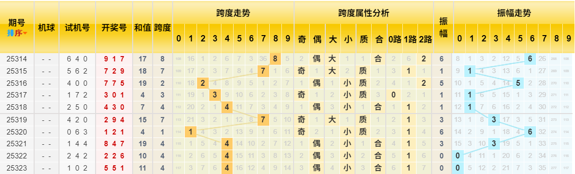 近10期跨度值(截至323期)为:8, 7 2, 3, 4, 7, 1, 4, 4, 4。跨度4在近期过于密集(10期内出现4次)。根据“热极转冷”的常见思路,本期应回避跨度4,关注其振幅变化。跨度可能向中大区间移动,重点关注 跨度6或7。历史同期数据也显示跨度6出现频率相对较高。