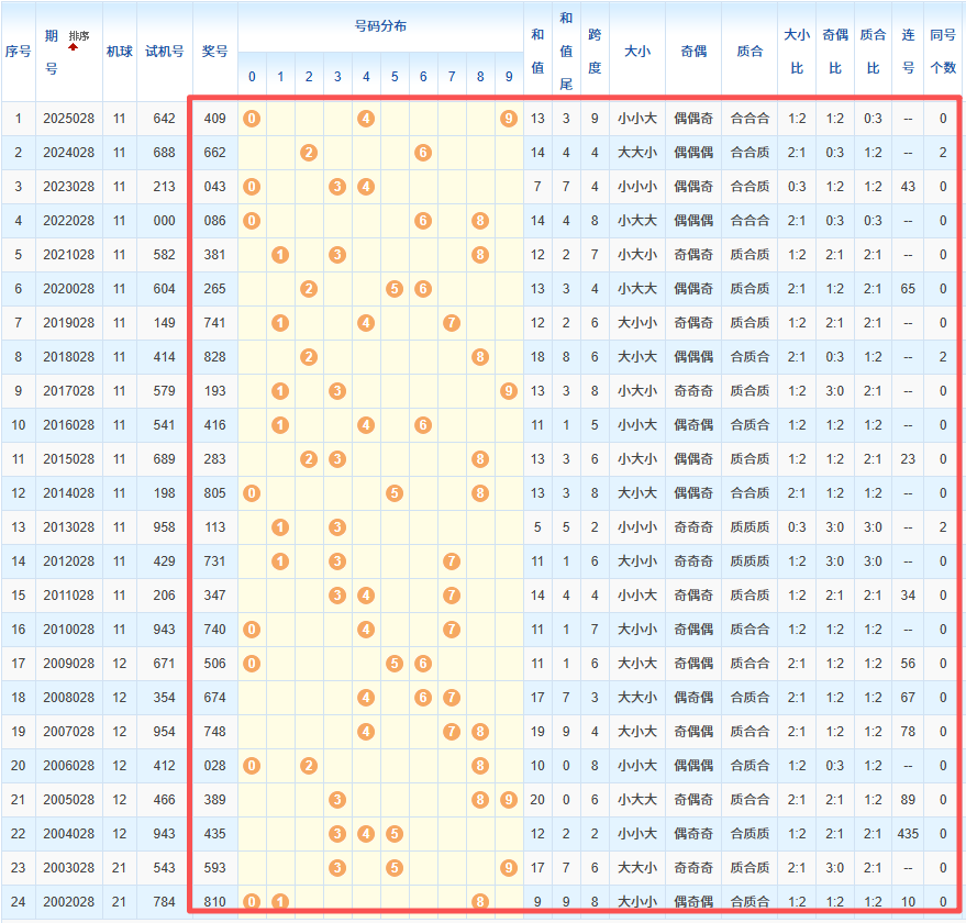 1、统计往年同期开奖号码
