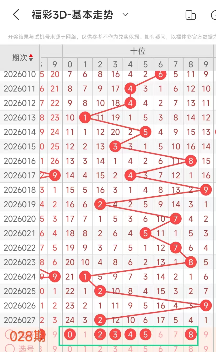 经统计0号出现8次、1号出现7次、2号出现5次、3号出现10次、4号出现9次、5号出现5次、6号出现6次、7号出6次、8号出现9次、9号出现4次.统计后出现次数靠前的数字作为我们的备选号码.其号码有01348等