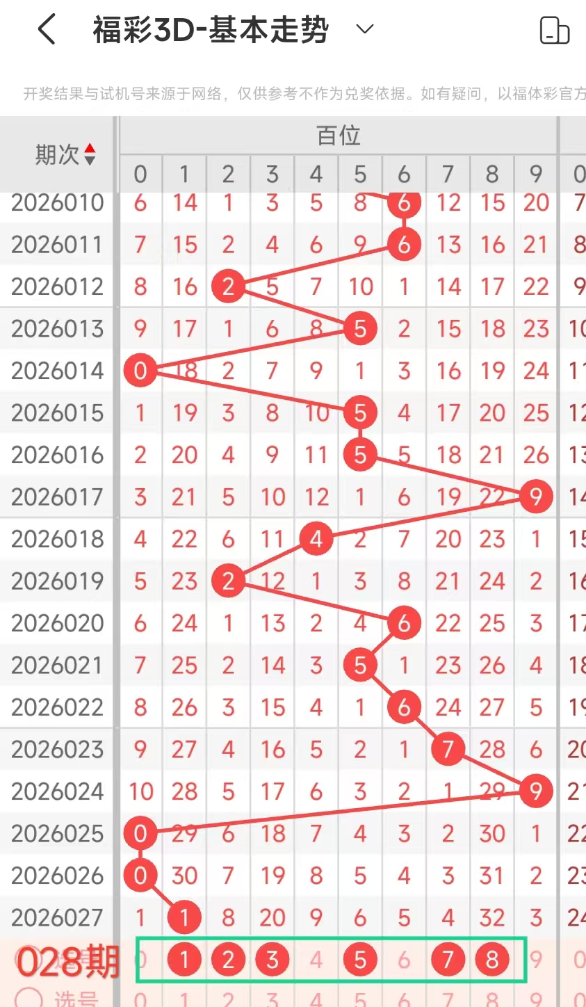 我们选取上期开奖号码126、在一起彩APP上截取前100期的数据,分别记录当开出百1、十2、个6、后下期开出什么号记录下来,然后一一分析。
