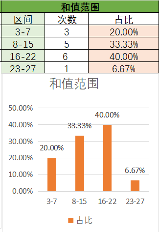 上期和值是11,处在8~15之间,其中8~15占比变大,16~22占比变小。目前是16~22的和值占比是最多的,优势是最好的其次是8~15之间,然后是3~7,最后是23~27。本期看好和值在8~15之间,其次是16~22