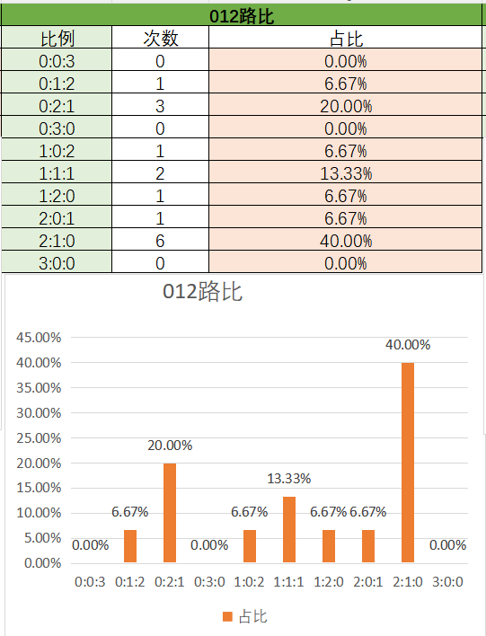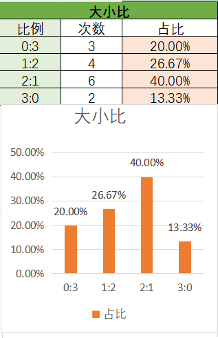 上期大小比为2:1,其中2:1占比变大,1:2占比变小。可以看到近15期内2:1优势最好的其次是1:2,最后是3:00:3。本期看好1:2开出,其次是2:1