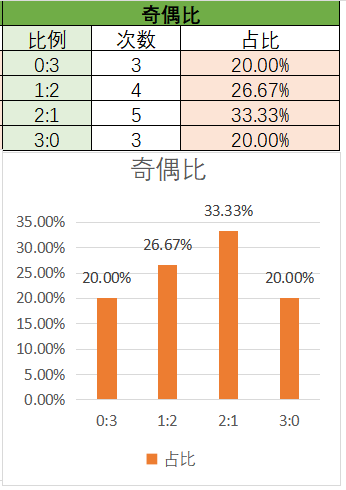 上期奇偶比为3:0,其中3:0占比变大,0:3占比变小。近15期内2:1优势最大,然后是1:2,最后是0:33:0上期开了3:0奇偶比,本期看好1:2奇偶比的开出,其次是2:1