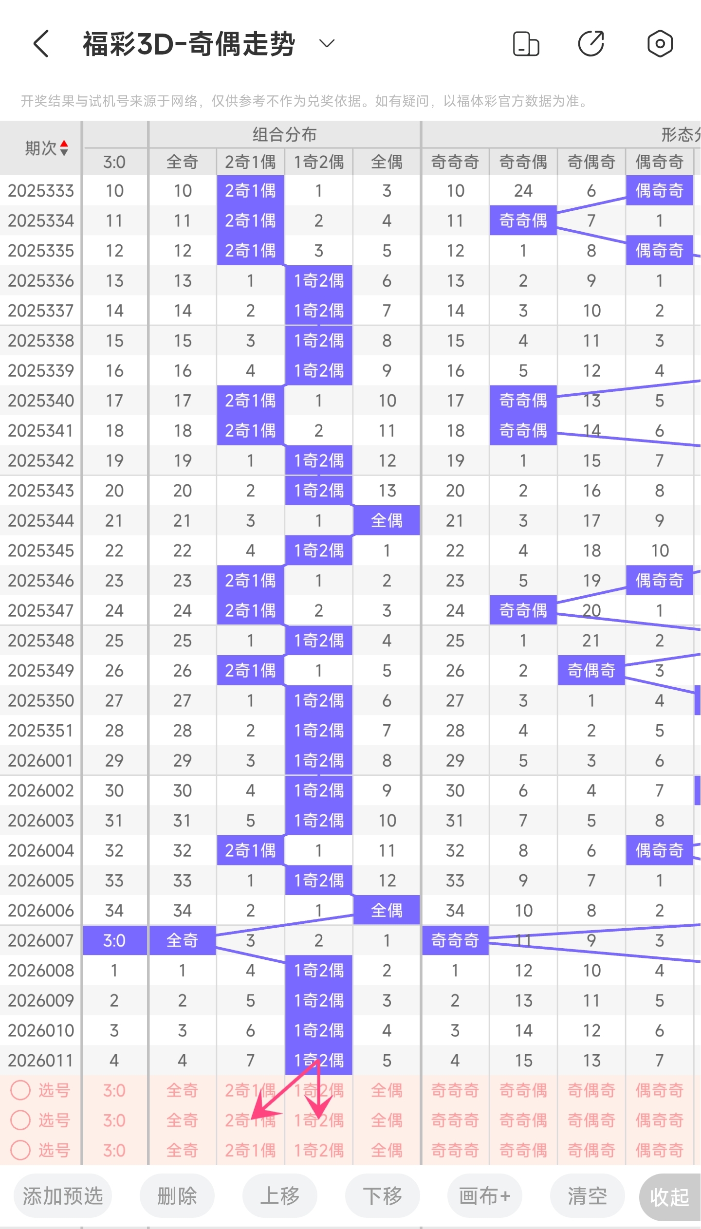 上期开了1奇2偶的情况,往前一期开出的是1奇2偶。从组合数学理论上来讲,开出2奇1偶和1奇2偶的概率都为37.5%,开出全偶和全奇的概率为12.5%。通过分析目前30期内的数据。本期的开出全偶的概率是6.66%,开出全奇的概率为3.33%,开出1奇2偶的概率为60%,开出2奇1偶的概率是30%。和前一期相比,概率没有变化。通过走势图可以看到,连续开了4期1奇2偶,本期比较看好2奇1偶回补。所以本期推测可能开2奇1偶,其次是1奇2偶,然后是全奇或者全偶类型。
