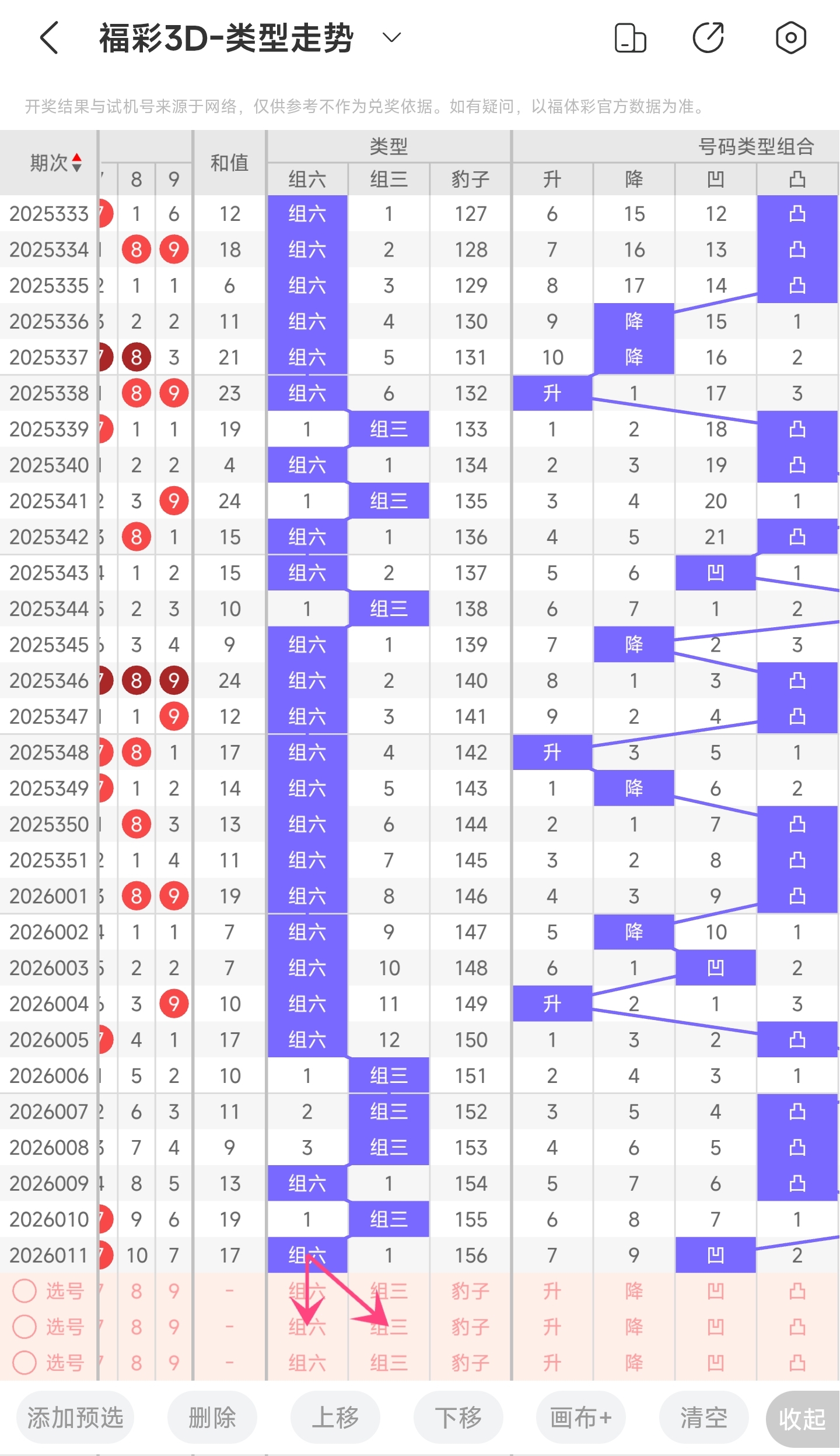 上期开出了组六类型,往前一期是组三类型。理论上开出组六的概率是72%,开出组三的概率是27%,开出豹子的概率是1%。通过分析目前30期内已经开出的概率,组六概率为76.66%,开出组三概率是23.33%。开出豹子的概率为0%。与前一期相比,组六概率变大,组三概率变小。通过走势图可以看到上期开了组六,本期看好组六。所以推测本期大概率开组六,小概率开组三。