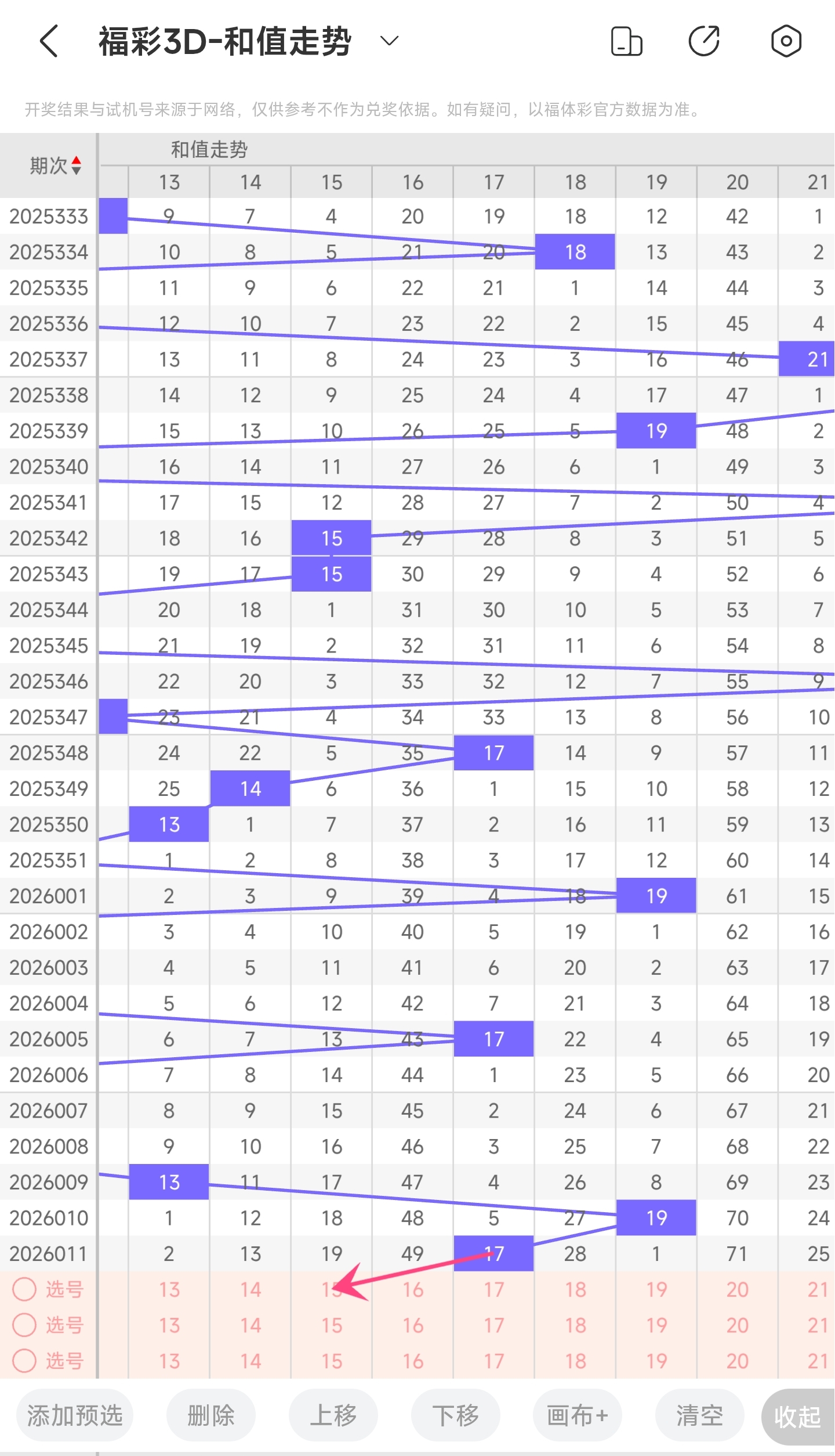 上期个位开出了7号球。往前一期开出7号球,趋势没有移动,偏移了0个点,振幅为0。通过分析走势图,目前的趋势是大概率往左,也可能往右。从偏移量来看,近几期偏移量都不算大,本期还是看好小偏移量的号码,防中等偏移量的。最后结合遗漏期数和冷热号。我们可以关注3,4,6,8,9等号。综上所述本期有可能开3,4,6,8,9等数。