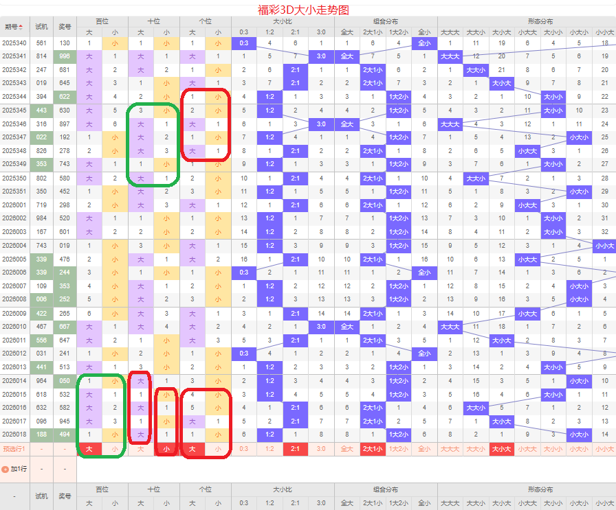 上期大小比为1:2,两小的号码组合方式,从近五期出现情况看,大号码出现7次,小号码出现8次,大小号码出现较平均,本期侧重两大的号码组合,本期百位侧重大号码,十位侧重小号码,个位要侧重看大,侧重大小大或者大小小的号码组合,根据大小做五码定位56789/01234/56789或56789/01234/01234