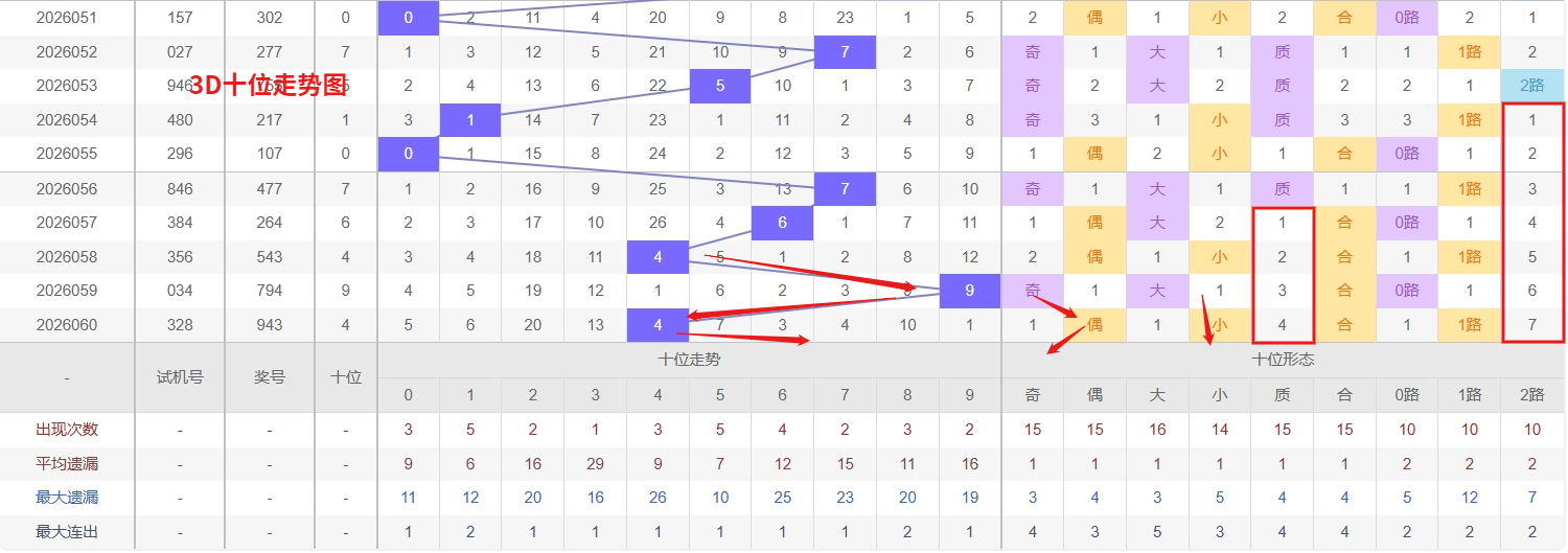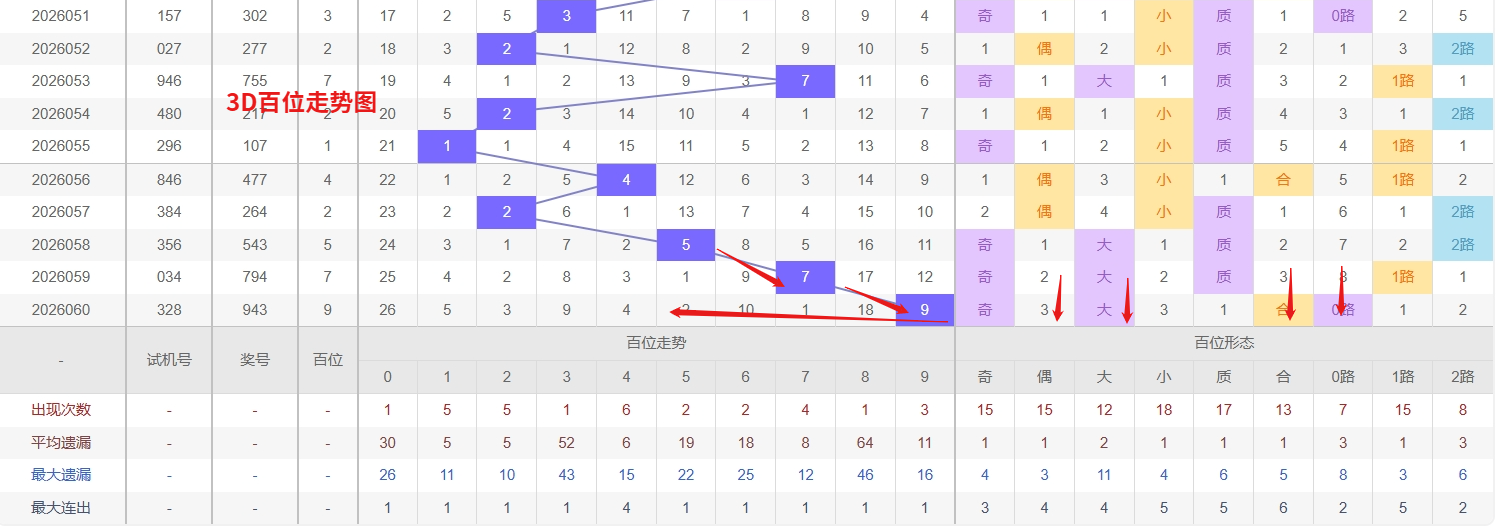 福彩3D百位分析:第2026060期百位开出号码9属于大奇数,从上面百位走势图上可以看出近100期大小比约为45:55奇偶比约为52:48。近期数据还是比较极端的符合文章开头介绍的求均衡规律非等量现象。但这种均衡不会持续最终会被偏态运行打破,然后循环往复。但短期内大小相差2点,小数过热大数有回补需求本期个人认为走大数的概率更高。上期百位落号“9”号球,在百位号码开出0路号码9后向大数方向走出2个振幅。那么通过分析上期百位落位号码分析,号码走出2个振幅,号码走为大奇数,开出0路号码9。通过对百位落号趋势来分析,百位号码落位后端,通过对近10期的走势来看百位号码大小交替频繁走3期大数又走2小数,近期3D百位走势来看,号码0与8作为冷号已遗漏多时,其遗漏期数远超理论值,进入了典型的回补窗口期,从概率补偿角度分析,这种深度冷态往往伴随着一次突然的回补,尤其是当其他热号频繁交替后,冷号更容易借机杀出;与此同时,号码4作为近期热号表现活跃,往往以重号或隔期再现的方式出现,其热度背后反映出当前百位数字的集中趋势,惯性较强,下一期仍需重点防范。因此,在接下来的选号中,建议以热号4为防守核心,同时适当留意冷号0与8的突然回补,我们在百位关注的重点在01468这5个号码球上,百位号码近期奇偶切换频繁,9号球码属于0路号码奇数,现奇数开出过多有向偶数的趋势。所以福彩3D第2026061期百位看01468。