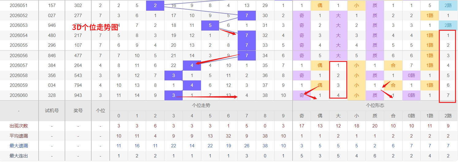 福彩3D个位分析:第2026060期个位开出号码3属于小奇数前端,从以上个位走势图中可以看出近100期的大小比约为47:53奇偶比约为54:46大小奇偶数据上有点差异有需求但不是太明显,不太好看这时就要借助连线走势和遗漏数据来帮助我们缩水号码。上期个位落号“3”小奇数0路号码球,号码开出了1振幅,连续多期的大振必被小振幅取代幅符合我们的预期,那么本期我们在个位考虑振幅走势走前依然要转变思路考虑大振幅,具体考虑(2-6)个振幅是我们主要的方向,那么在对个位落号情况进行系统的分析时我们可以明显的看到个位号码走势呈现大范围震荡,尤其是在号码的落位特点上表现的尤为突出,那么本期我们在个位分析时就要注意号码的风险,避免出现踏空。近期3D个位走势来看,号码6和8作为冷号已遗漏多期,其遗漏值远超出理论周期,进入了典型的回补窗口期,从概率补偿的角度分析,这种深度冷态往往伴随着一次突然的反弹,尤其是在热号轮动间隙,冷号更容易借机杀出;与此同时,号码2作为近期热号表现活跃,往往以连开或隔期回补的形态展现,其热度背后反映出当前个位数字的集中趋势,惯性较强,下一期仍需重点防范。因此,在接下来的选号中,建议以热号2为防守核心,同时适当留意冷号6与8的突然回补,因此福彩3D第2026061期个位看好02568。