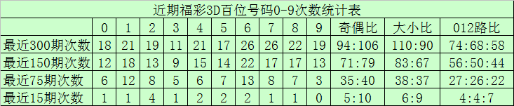 百位分析:最近300期奖号由冷到热表现为:523,324,0127,229,931,4832,635,740次,奖号奇偶比为145:155,大小比为161139012路比为117:99:84