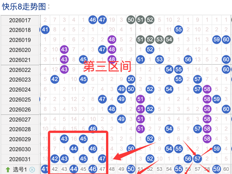 三区间开出了7个奖号(42.43.45.47.52.56.57)上期回顾三区开出7个奖号上期的三区间的奖号数量呈现一个递增的形态,4头回补4号码,本期先来看号码41近期出现频率相对来说不是很稳定。偶尔有时间隔期数也是很长,说明其在近期的开奖中较温冷的,号码46在近 30 期内出现次数相对较不是稳定的号码,近期的活跃度也是较温热。号码50有一定的间歇性,通常间隔5-3期会出现一次,没有明显的连续出现态势,走势相对不是很稳定,在整个第三区间的表现本期还是可以防守的。号码59走势相对近期较热,近期有连续间隔落号的情况,活跃度近期处于较热状态注意防守。