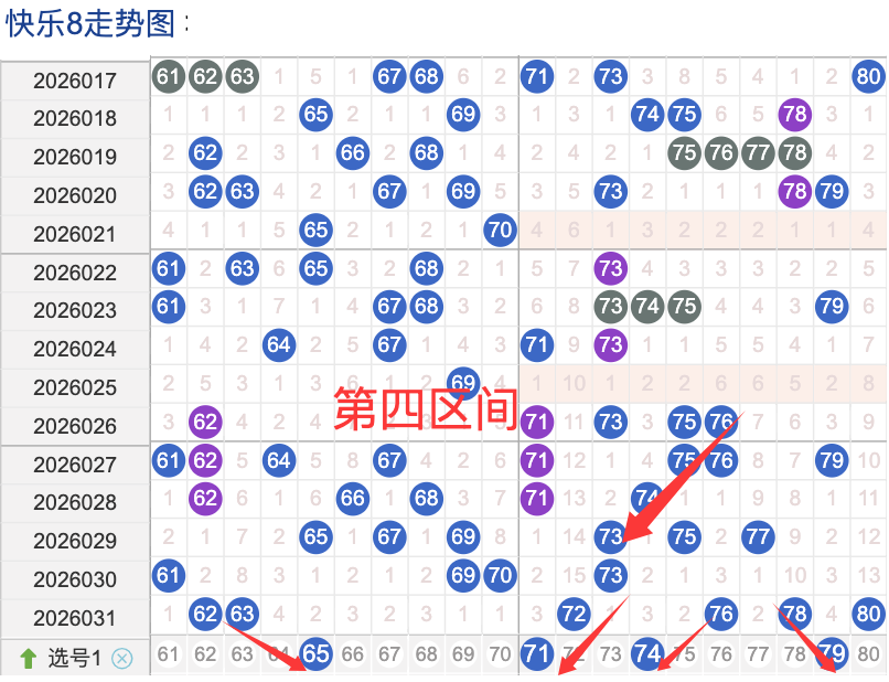 上期四区间开出了6个奖号(62.63.72.76.78.80)上期的四区开6个奖号呈现了一个递增的趋势,开出的奖号7头回补3个,6头回补2个,先来看号码65在近 30 期内属于还是很稳定的号码,近期出现频率相对也是稳定的,偶尔会间隔多期后出现一次,这个号码要注意防守,号码71具有一定的间歇性活跃度较稳定比如有时会间隔 3到5期就再次出现,也有时会间隔多期,近期整体出现频率比较热,近期还是要关注的.号码74活跃度近期比较热,有一定的间歇性。活跃度近期较热,整体走势有一定的波动性.