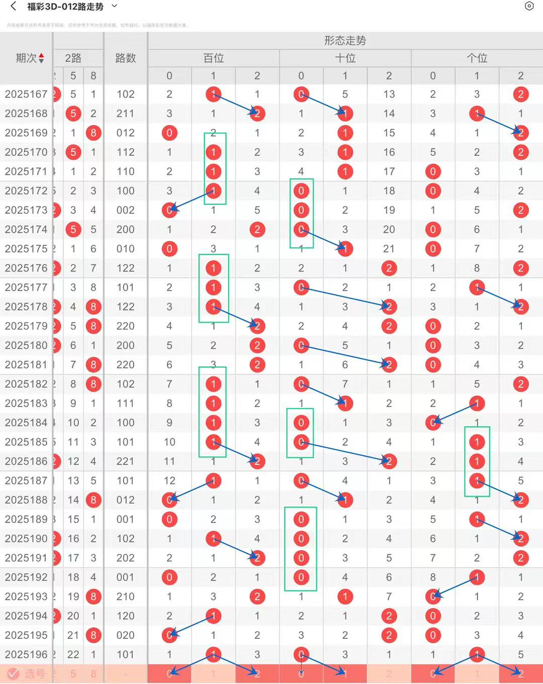 福彩3D中,012路是把0-9这10个数字按除3余数划分,0、3、6、9为0路,1、4、7为1路,2、5、8为2路。以下是对近30期百、十、个位012路形态走势分析