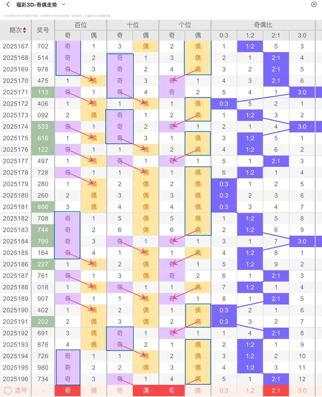 根据上期开出奇数连下分析,百位奇数和偶数呈现交替出现的态势,且存在一定的连出规律。有时奇数会连续多期开出,形成连下的情况,例如在部分区间内,奇数连续出现,构成一个小的奇数连开周期。但在连开之后,往往会出现偶数回补的现象,箭头指示着奇偶交替的节点。不过,这种交替并非完全固定的模式,连开奇数或偶数的期数存在波动,本期参考奇数连下(13579)