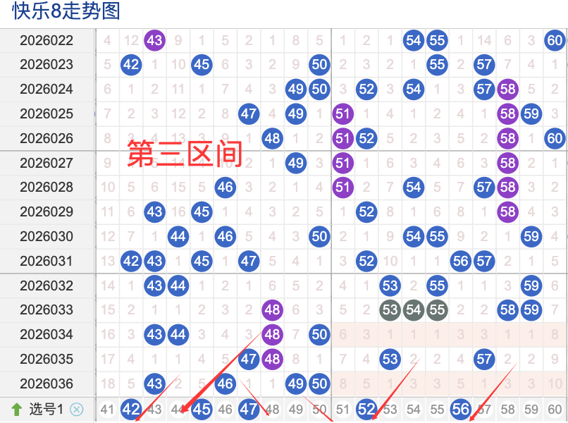 三区间开出了4个奖号(43.46.49.50)上期回顾三区开出4个奖号上期的三区间的奖号数量呈现一个不变的形态,4头回补3号码,本期先来看号码42近期出现频率相对来说还是很稳定。偶尔有时间隔期数也是很长,说明其在近期的开奖中较温热的,号码45在近 30 期内出现次数相对较还是稳定的号码,近期的活跃度也是较稳。号码47有一定的间歇性,通常间隔5-3期会出现一次,没有明显的连续出现态势,走势相对还是很稳定,在整个第三区间的表现本期还是可以防守的。号码52走势相对近期较热,近期有连续间隔落号的情况,活跃度近期处于较热状态注意防守。