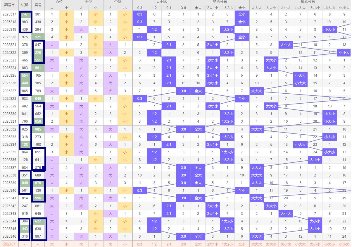 大小走势分析 在346期中,开奖号码为897.;偶奇奇形态;大小比为3:0,大数占据优势。回顾历史数据,发现大小比常常在短期内呈现波动,但长期趋于平衡。因此,在347期中,相信大小比将继续调整,倾向于保持大数优势。基于这一逻辑,预判347期的大小走势可能为“大中小”或“中小大,这样的组合不仅符合历史波动规律,也体现了当前大小比调整的趋势。近十期大小比为21:9大数占据优势,关注两小一大号码
