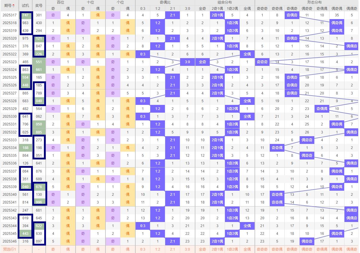 奇偶比例分析 346期的开奖号码为897奇偶比为2:1,奇数占据主导地位。在奇偶比例的分析中,同样注重平衡原则。考虑到近期奇偶比的波动,可以预判347期的奇偶比例将继续保持平衡,即可能为2:1或1:2。这样的预判不仅符合历史数据的统计规律,也体现了奇偶比例在短期内的调整趋势。