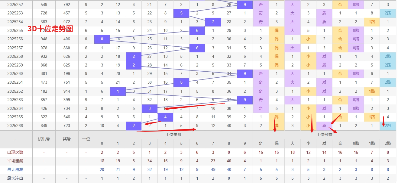 福彩3D十位分析:第2025266期十位开出号码2属小偶数号码前端。以历史100期数据为例十位奇偶比约为51比49,大小比约为52比48近期大小相差2点,根据求均衡的规律开出小数的概率比大数高一点。上期我们分析奇数经过连续回补后有走偶数的可能,开出奖号2小偶数符合我们的预期。近期3D十位走势分析,号码6作为持续走强的热号,表现出明显的活跃态势,热号往往具备一定的惯性冲力,短期内连下的可能性较高,需重点关注其持续热出的节奏。另一方面,号码8已连续遗漏40期,属于极端冷态,从概率均衡与冷号回补规律来看,冷号在长期遗漏后反弹的动力会逐渐增强,此时需严防其突然解冻开出。综合判断,十位6与8形成鲜明的冷热对比,在追踪热号延续性的同时,也要警惕冷号回补的突发可能,所以福彩3D第2025267期十位推荐01468。本文由一起彩钱是生命动力所著,请勿转载