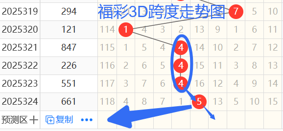 2)我们来看跨度;还是以320期——324期为例,如图依次是14445跨度,按照路数转换关系来看,那么跨度我们暂定1470369跨 ,本期个人比较看好6 0 4 跨。