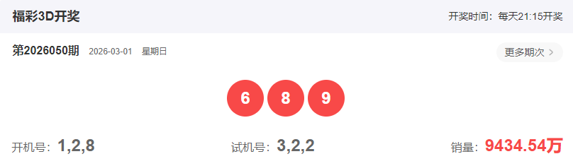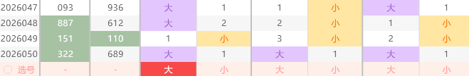 现在我们来回顾一下上期福彩3D,2026050期开出的奖号689,形态组六(半顺),大大大,和值23,3跨 合合合形态