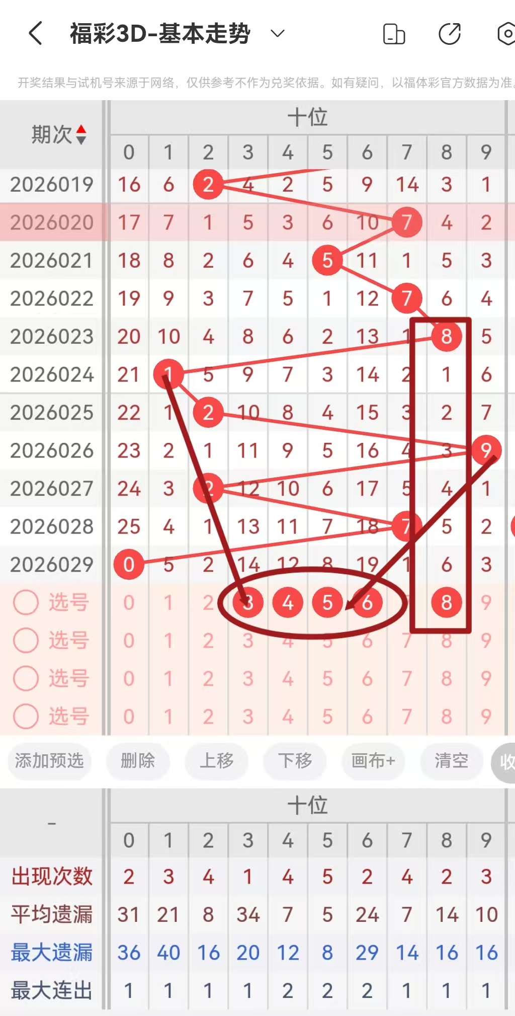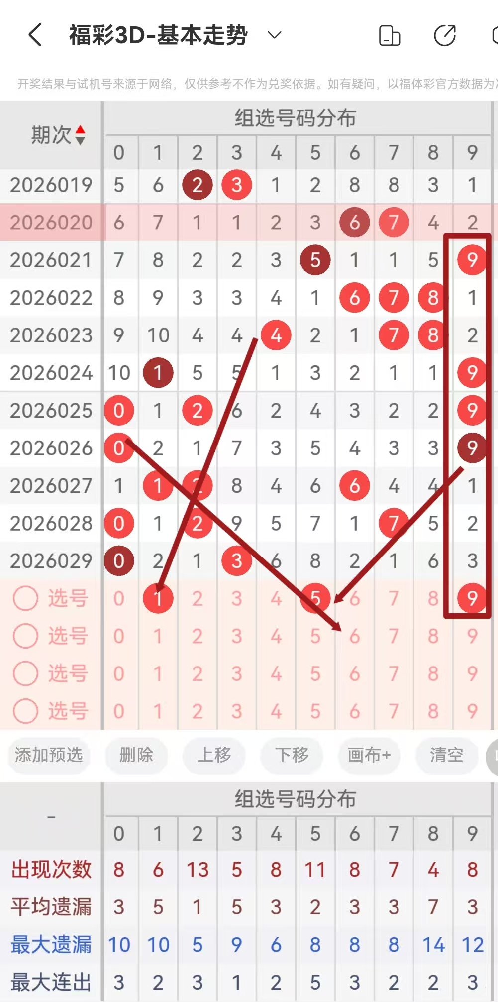 单区间看好以后!我们来分析一下整体的跨度和值走势!近10期,一共出现了半顺2次,对子号码5次!本期考虑,组三半顺和杂六!
