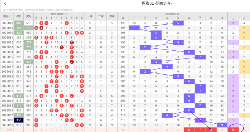 通过观察跨度及跨度属性走势可以发现:近10期内跨度较少开出09等号码,本期跨度大概率仍然不会开出09等号码,因此本期跨度选号时应该优先排除09等号码。结合上述跨度走势图来看,本期跨度看好567等号码。