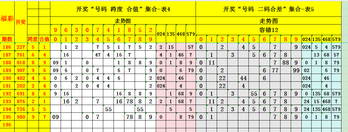 (三)依据开奖号、二码合、二码差,搭建一个由数字0123456789组成的“码合差”走势图,见表5: