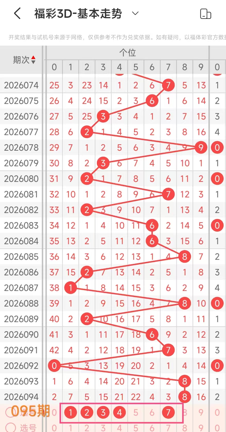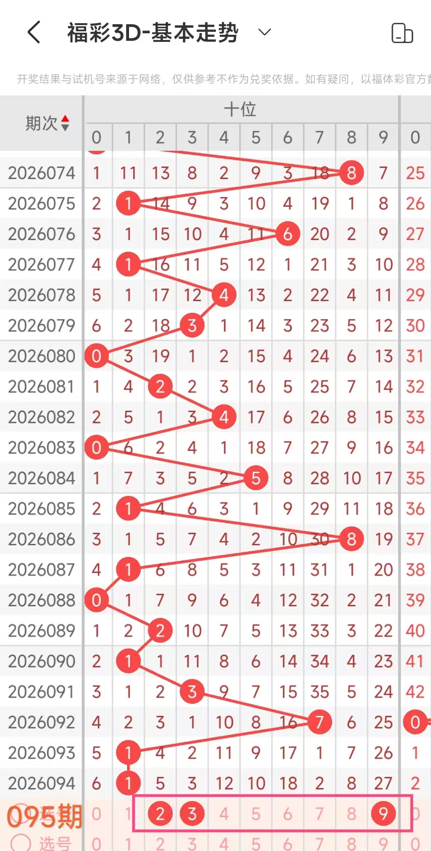 3、当个位开出8后下期开出:3044228,经统计0号出1次、1号出现0次、2号出现2次、3号出现1次、4号出现2次、5号出现0次、6号出现0次、7号出现0次、8号出现1次、9号出现0次。观察发现24号出现频繁,本期可以考虑。