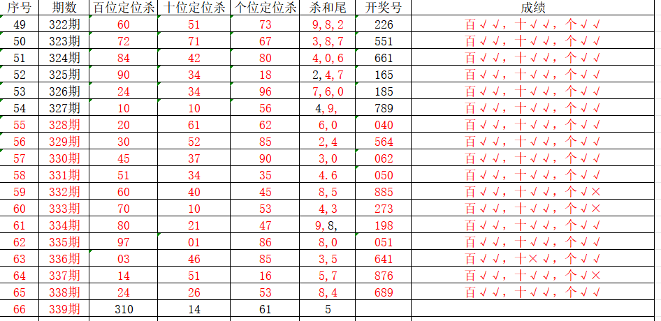 2、当十位开出8后下期开出:66847,经统计0号出0次、1号出现0次、2号出现0次、3号出现0次、4号出现1次、5号出0次、6号出现2次、7号出现1次、8号出现1次、9号出现0次。观察发现6号还没有出,本期可以考虑。