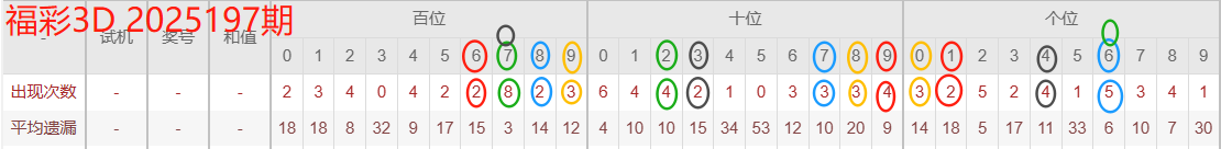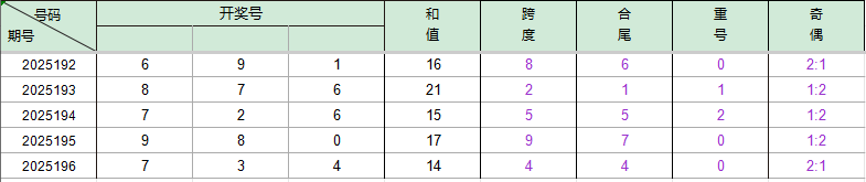 2025192期开奖号码691,我们可以看出近30期百位6出现2次(较195期减2),十位9出现4次,个位1出现2次。
