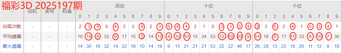 2025195期开奖号码980,我们可以看出近30期百位9出现3次,十位8出现3次,个位0出现3次。