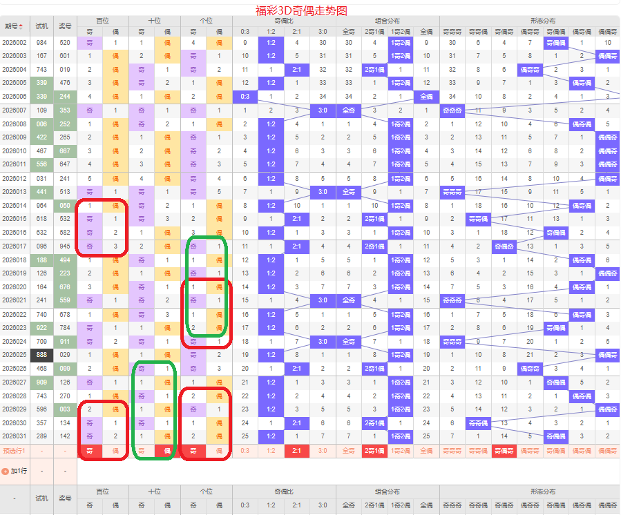 上期奇偶比是1:2,两偶的号码组合方式,从近五期的奇偶数出现情况看,奇数出现6次,偶数出现9次,奇数号码出现较少,本期侧重两奇的号码组合,侧重奇偶奇或奇偶偶的号码组合方式,根据奇偶形态做五码定位13579/02468/13579或13579/02468/02468