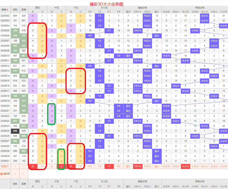 上期大小比为0:3,全小的号码组合方式,从近五期出现情况看,大号码出现2次,小号码出现13次,大号码出现较少,本期侧重两大的号码组合,本期百位侧重大号码,十位侧重小号码,个位要侧重看大,侧重大小大或者大小小的号码组合,根据大小做五码定位56789/01234/56789或56789/01234/01234