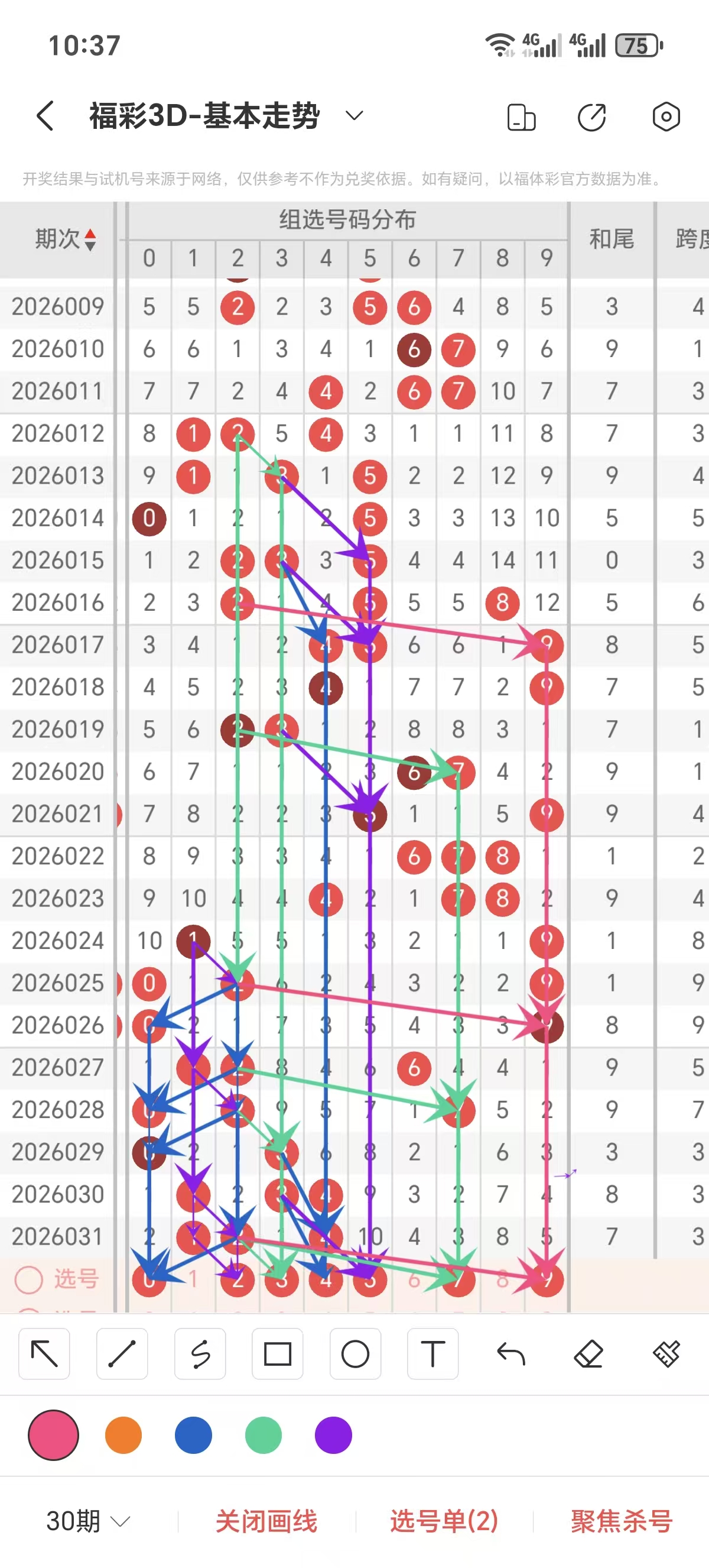 跨度通常情况下在五期之内重复一个跨度的概率很高,近五期重复了3的跨度,近五期跨度为5/7/3/3/3,近期0路的跨度较热,上期是0路的跨度,本期要侧重跨度以3/5/7跨为主的号码组合。可以从跨度方面选择相应的双胆码组合,双胆码的选取要根据近期和历史的走势进一步的分析选取。
