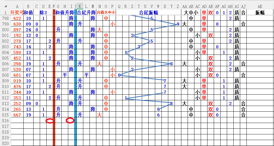 如上图3,和值升降平分析,和值升概率大,小于19和值