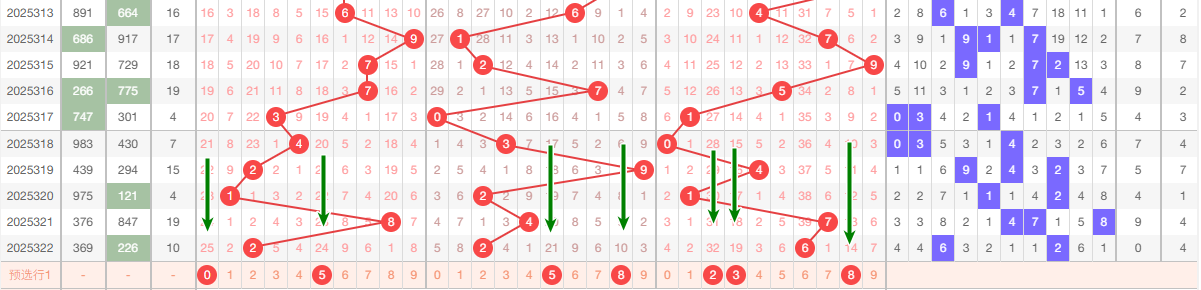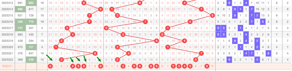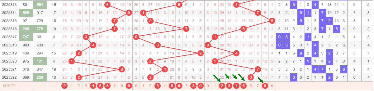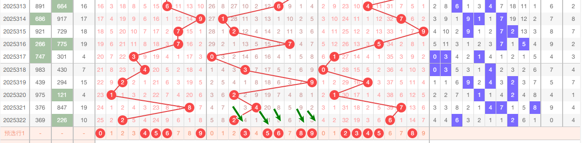 上期十位开出2,本区与上期的跨度为2,本期我们可以从上面走势图中看出选号的思路,本期十位推荐关注:35689