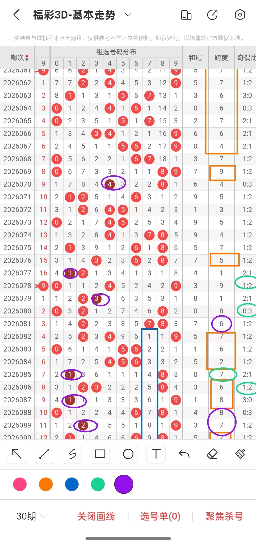 4.近30期中,跨度6和7出现的次数很多(热跨),3456跨度比较温,冷8跨近期已经回补,2跨近期还没回补需,所以近期需要重点关注2.6.7.8跨度。