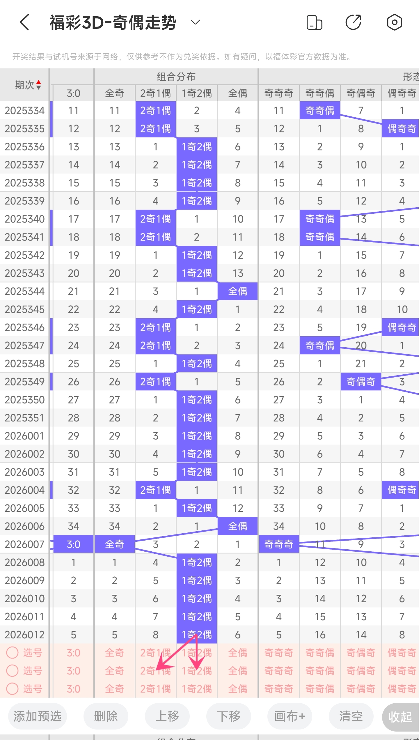 上期开了1奇2偶的情况,往前一期开出的是1奇2偶。从组合数学理论上来讲,开出2奇1偶和1奇2偶的概率都为37.5%,开出全偶和全奇的概率为12.5%。通过分析目前30期内的数据。本期的开出全偶的概率是6.66%,开出全奇的概率为3.33%,开出1奇2偶的概率为63.33%,开出2奇1偶的概率是26.66%。和前一期相比,1奇2偶概率变大,2奇1偶概率变小。通过走势图可以看到,连续开了5期1奇2偶,本期比较看好2奇1偶回补。所以本期推测可能开2奇1偶,其次是1奇2偶,然后是全奇或者全偶类型。