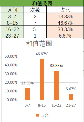 上期和值是23,处在23~27之间,其中23~27占比变大,3~7占比变小。目前是8~15占比最优,其次是16~22,然后是3~7,最后是23~27。本期看好和值在8~15之间,其次是16~22