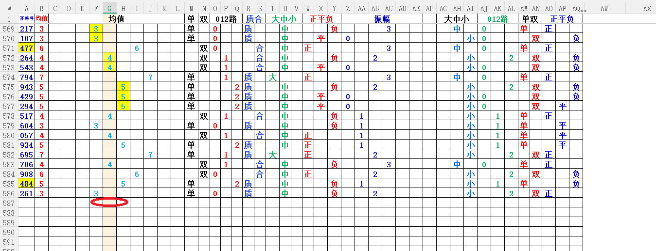 均值:就是开奖号每各数的总和除3,然后得到的余数,如果不够整除可以+1,-1,直到被整除得的数就是均值